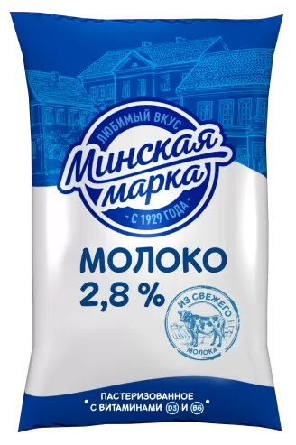 Молоко питьевое пастеризованное с витаминами массовой долей жира 2,8 %, п/эт.пл., 0,9 л., т.м. Минская марка